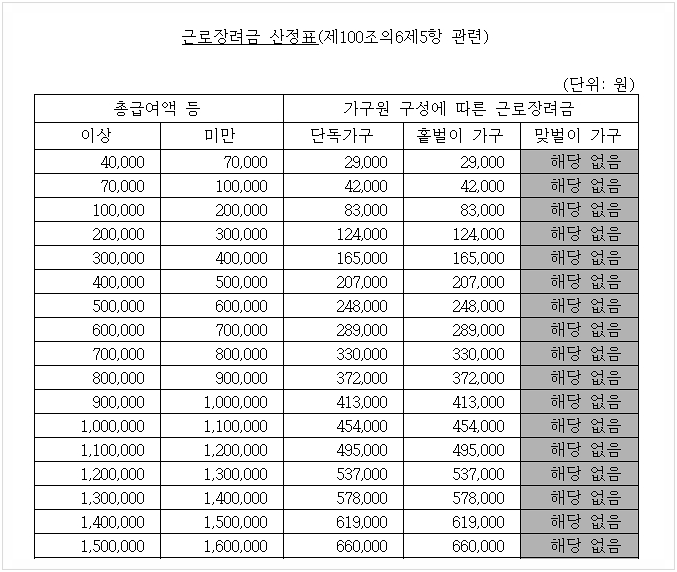 근로장려금 산정표