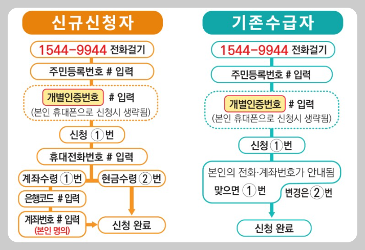 휴대폰을 이용하여 전화로 신청을 진행하는 방법으로 모바일 또는 컴퓨터로 신청하는게 어려우신 분들은 ARS 전화로 신청하는 것을 추천드립니다.