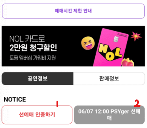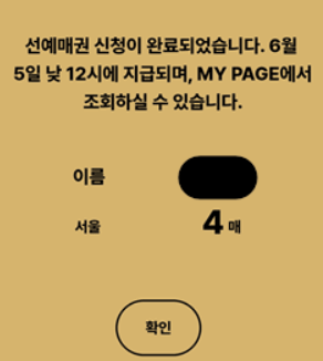 - 6월 10일 낮 12시 선예매 인증버튼이 활성화됩니다. 이후 아래와 같이 선예약 인증을 진행해주세요.